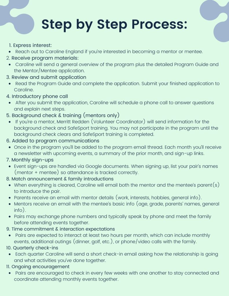 *Please note, each event is subject to change. If any event is changed, we will communicate the cancellation with mentor and mentee.*